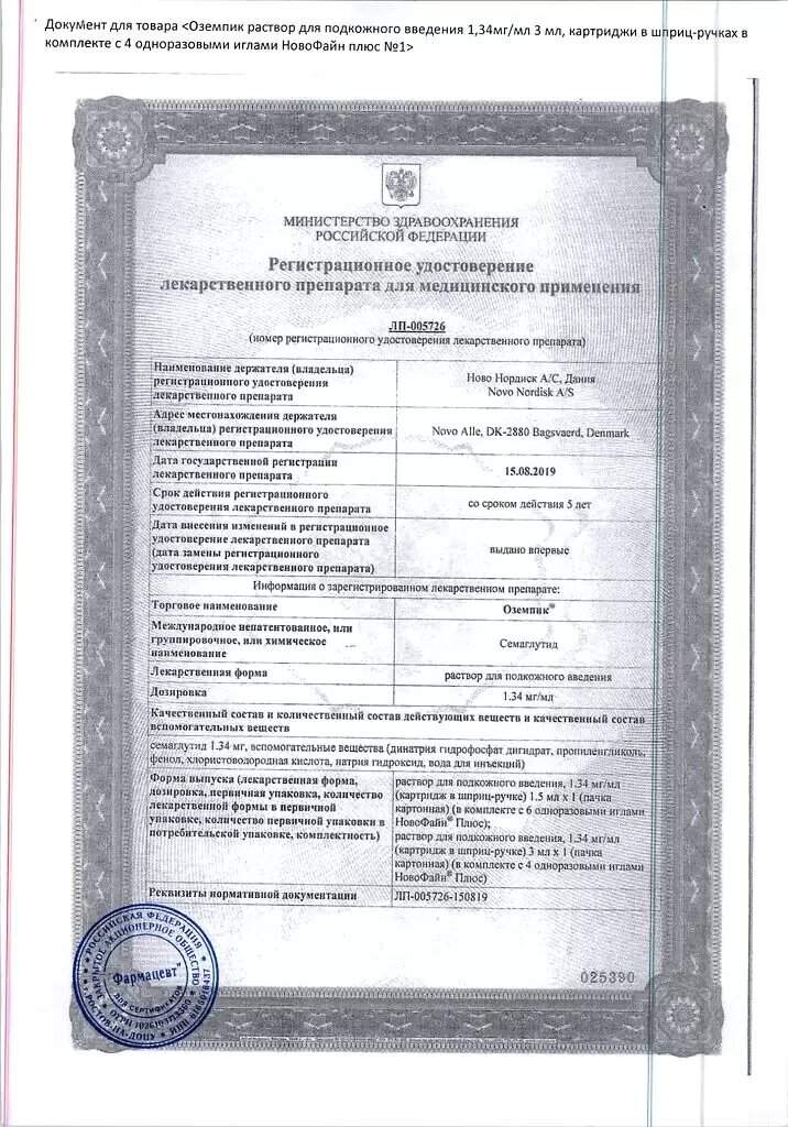 В 1 мл препарата содержится: действующее вещество: семаглутид 1,34 мг.