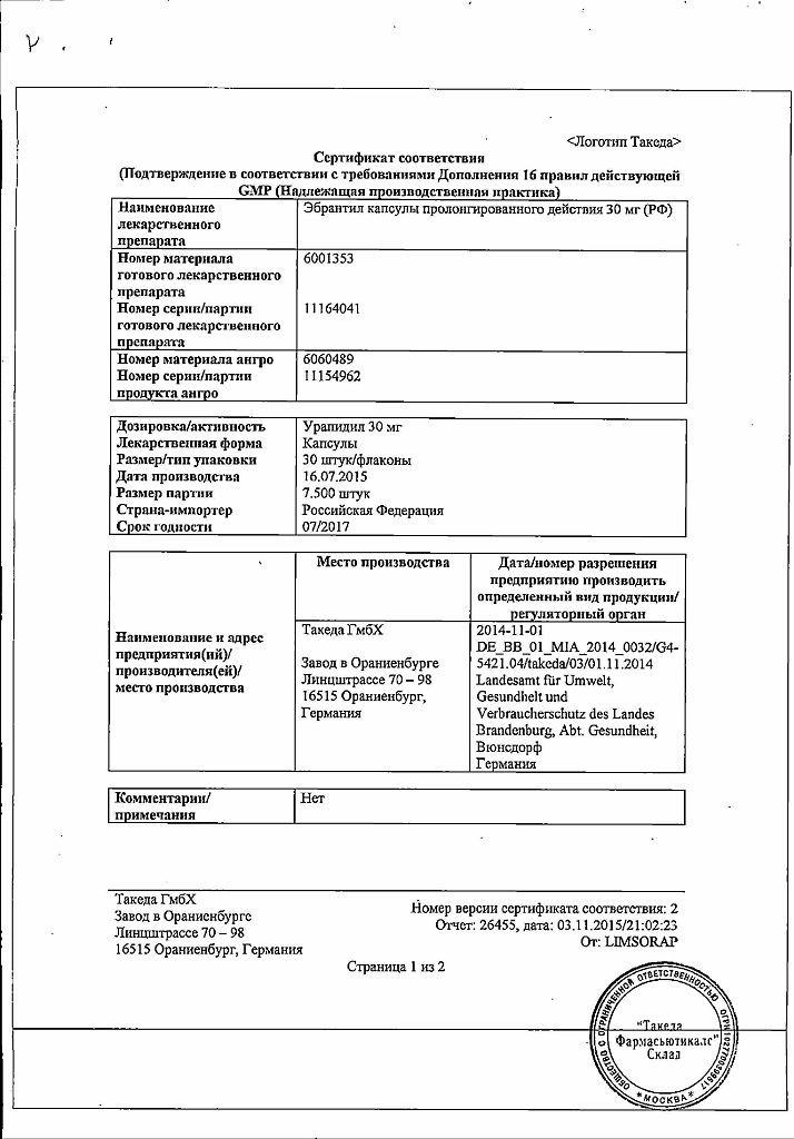 Применение. Капсулы Эбрантил принимают внутрь, утром и вечером, одновременно с приемом пищи. Рекомендованная дозировка составляет по 1 капс. 30 мг 2 раза в день. При необходимости доза препарата Эбрантил может быть увеличена до 120 мг (по 2 капс. 30 мг или по 1 капс. 60 мг 2 раза в день).