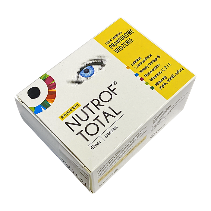 Капсулы Nutrof Total специально разработаны для обеспечения организма необходимыми питательными веществами, которые защищают зрение и защищают глаза от свободных радикалов. Цинк, медь, селен и витамины С и Е поставляются с добавкой, потому что организм не может производить их сам. Они помогают защитить клетки от свободных радикалов. Витамин А и В2 способствуют поддержанию нормального зрения. Дополнительный лютеин входит в состав желтого пятна, точки наиболее острого зрения, и поддерживает ее в здоровом состоянии.